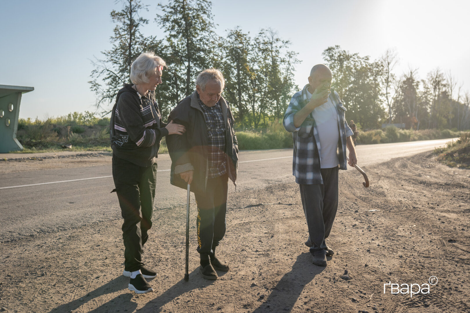 Близько 7 ранку ми приїжджаємо до Куп’янського району, зустрівши перших місцевих на евакуацію — Сергія, Аллу та третього чоловіка, який попросив не вказувати його ім’я. Родом вони з Осинового, де вже йдуть запеклі бої, тому підвезти їх до відносно безпечного місця погодилися інші сміливі люди.