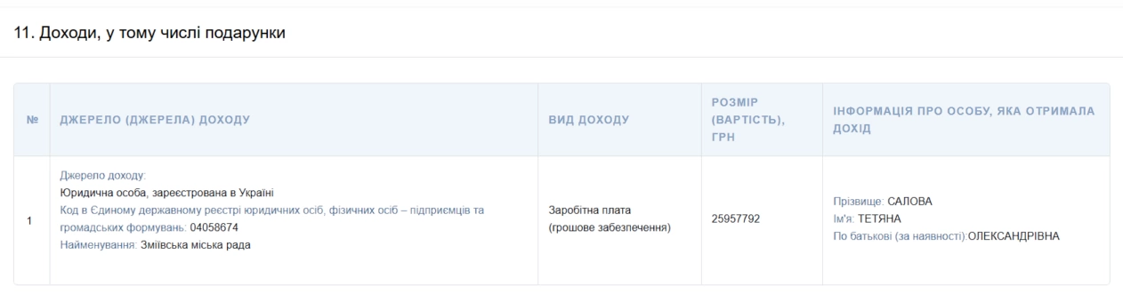Відомо, Тетяна Салова обіймає посаду головного спеціаліста сектору з висвітлення діяльності Зміївської міськради. У щорічній декларації жінка вказала дохід від заробітної плати у розмірі 25 мільйонів 957 тисяч 792 гривні.