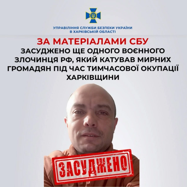 У Харківській області заочно засудили за воєнні злочини російського військового, причетного до катувань мирних жителів під час тимчасової окупації частини Харківської області.