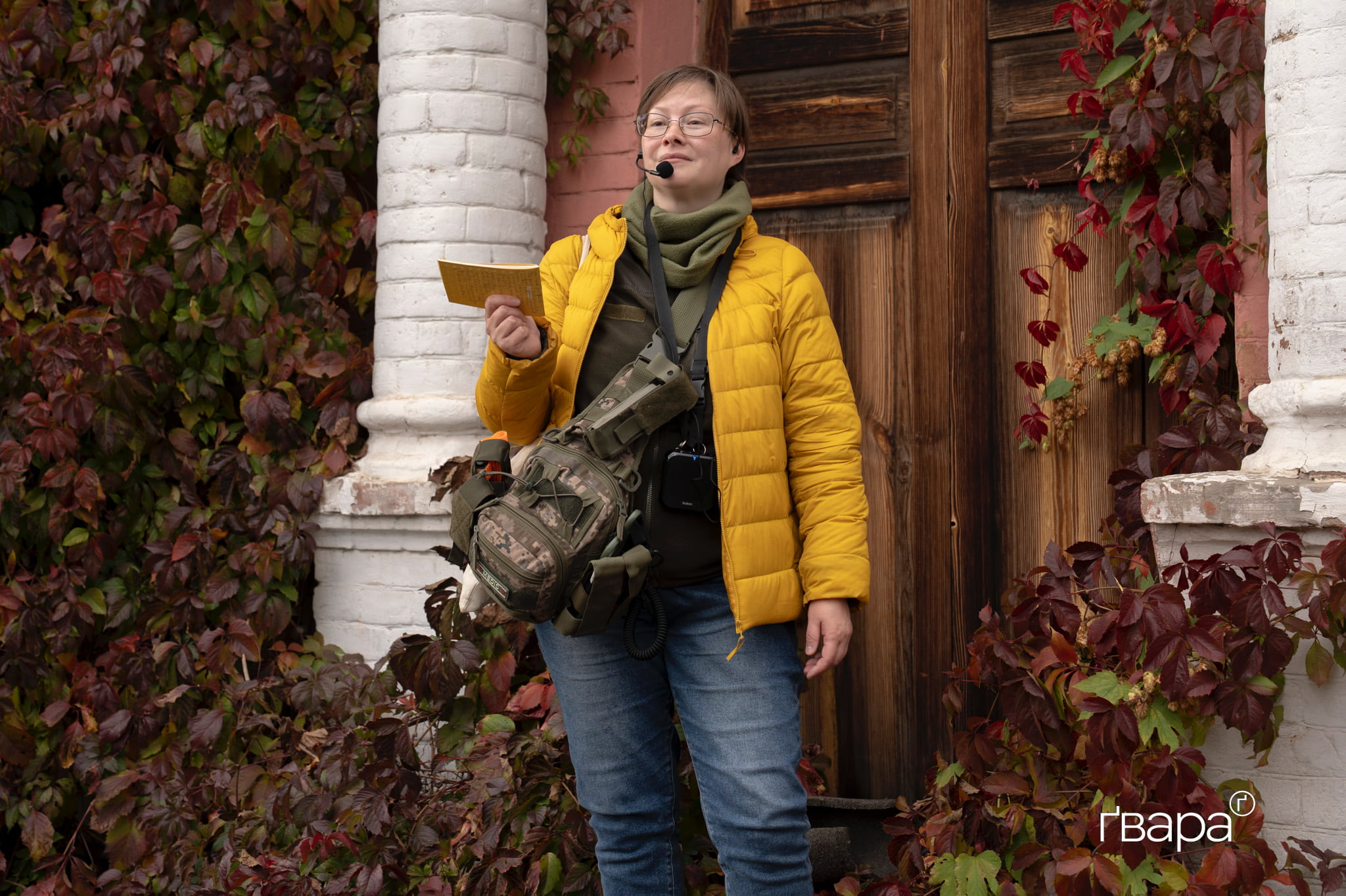 Олександру Воскобойник можна легко впізнати з натовпу — сонячна жовта куртка, велика сумка-аптечка через плече та усмішка. Попри те, що на її екскурсію прийшло небагато людей, вона з ентузіазмом розповідає про життя Міхновського.