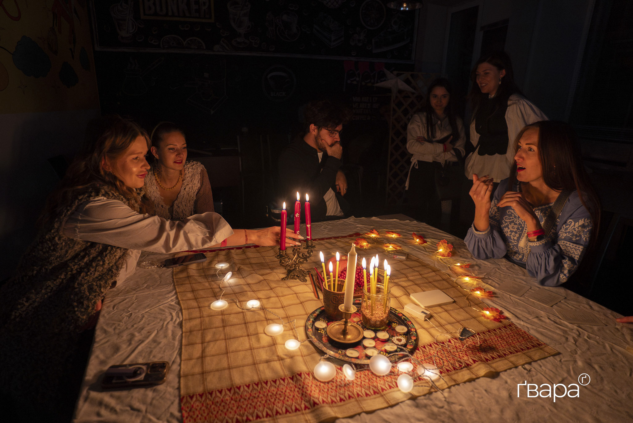 Навколо столу з ворожіннями чимало дівчат, які хочуть дізнатися про свою долю. «Ворожка» Світлана Жмихова, яка представляє організацію ФРІ Харків, пропонує на вибір кілька методів ворожінь: на нитках, на кільці, на записках, на свічці й воді, а також на предметах у глечику. Одна з дівчат у червоній силянці обирає перший варіант.