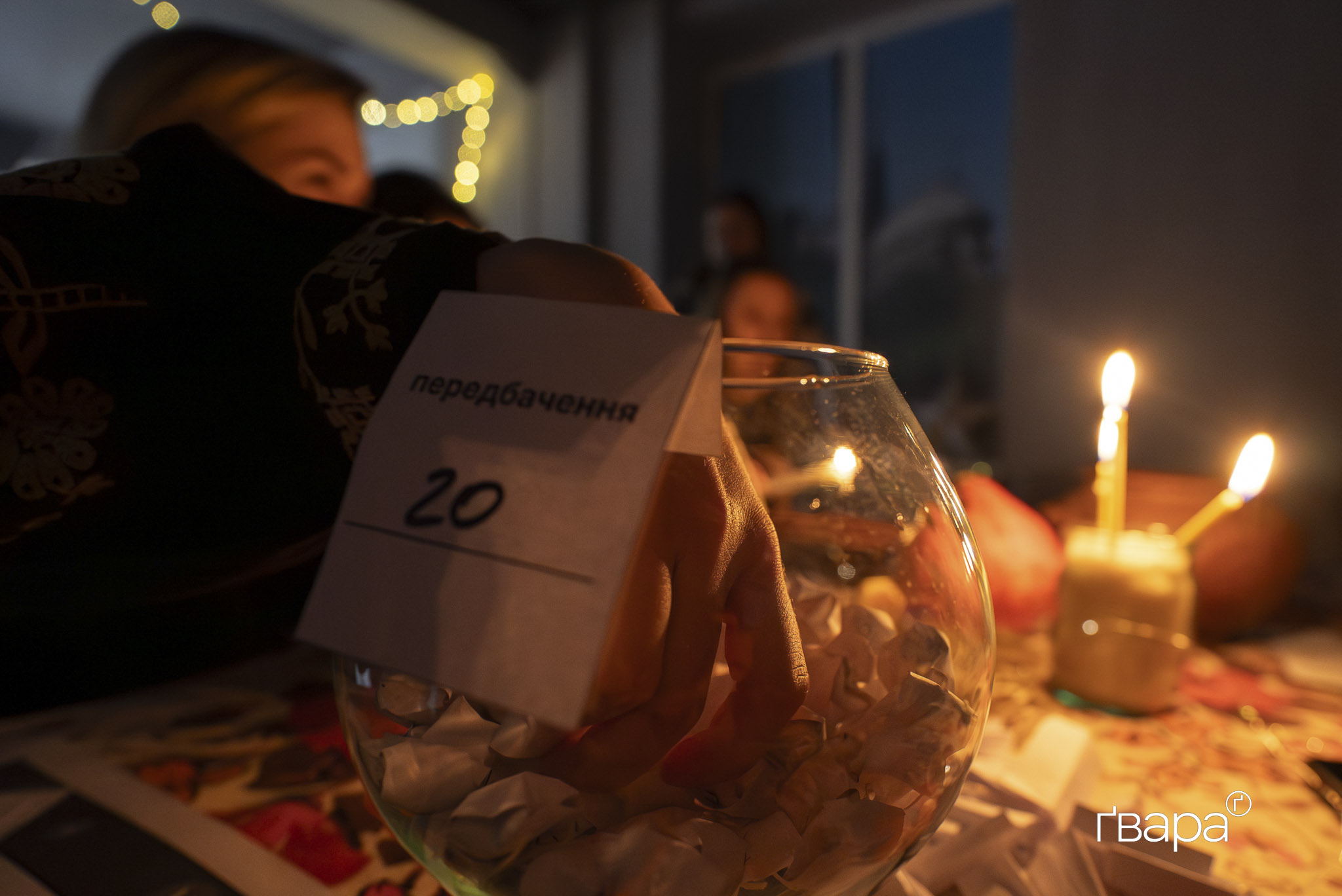 Ми говоримо у напівтемній залі. Тут тихо: горять свічки й пахне водночас і воском, і парафіном. Дівчата грають у «Флірт Калину», ворожать і пишуть листи пораненим бійцям.