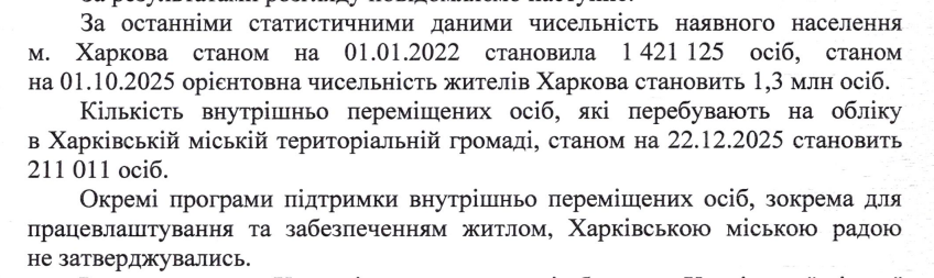 У Харкові станом на жовтень 2025 року проживає близько 1,3 мільйона людей. Станом на 1 січня 2025 року у місті жило понад 1,4 мешканця.