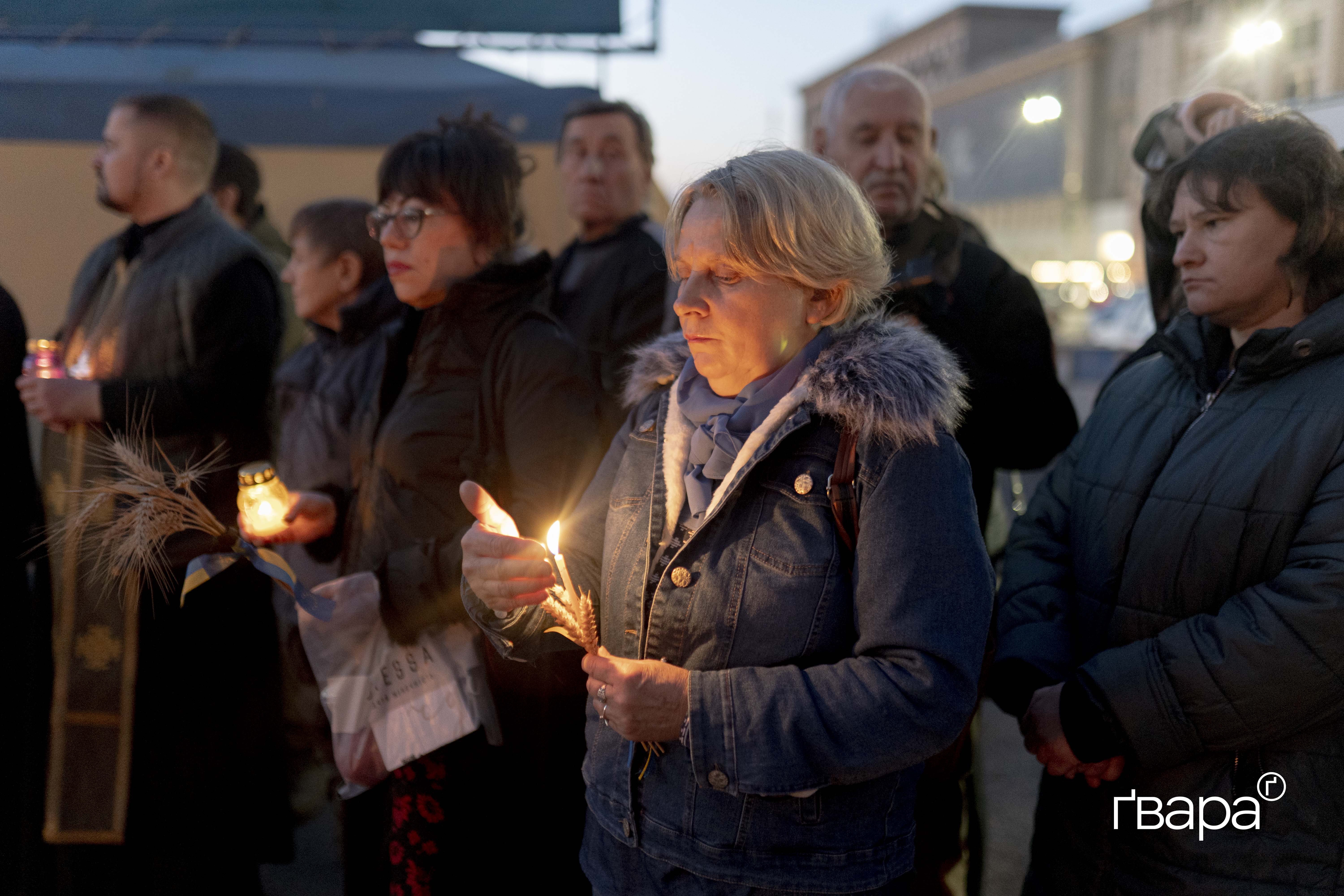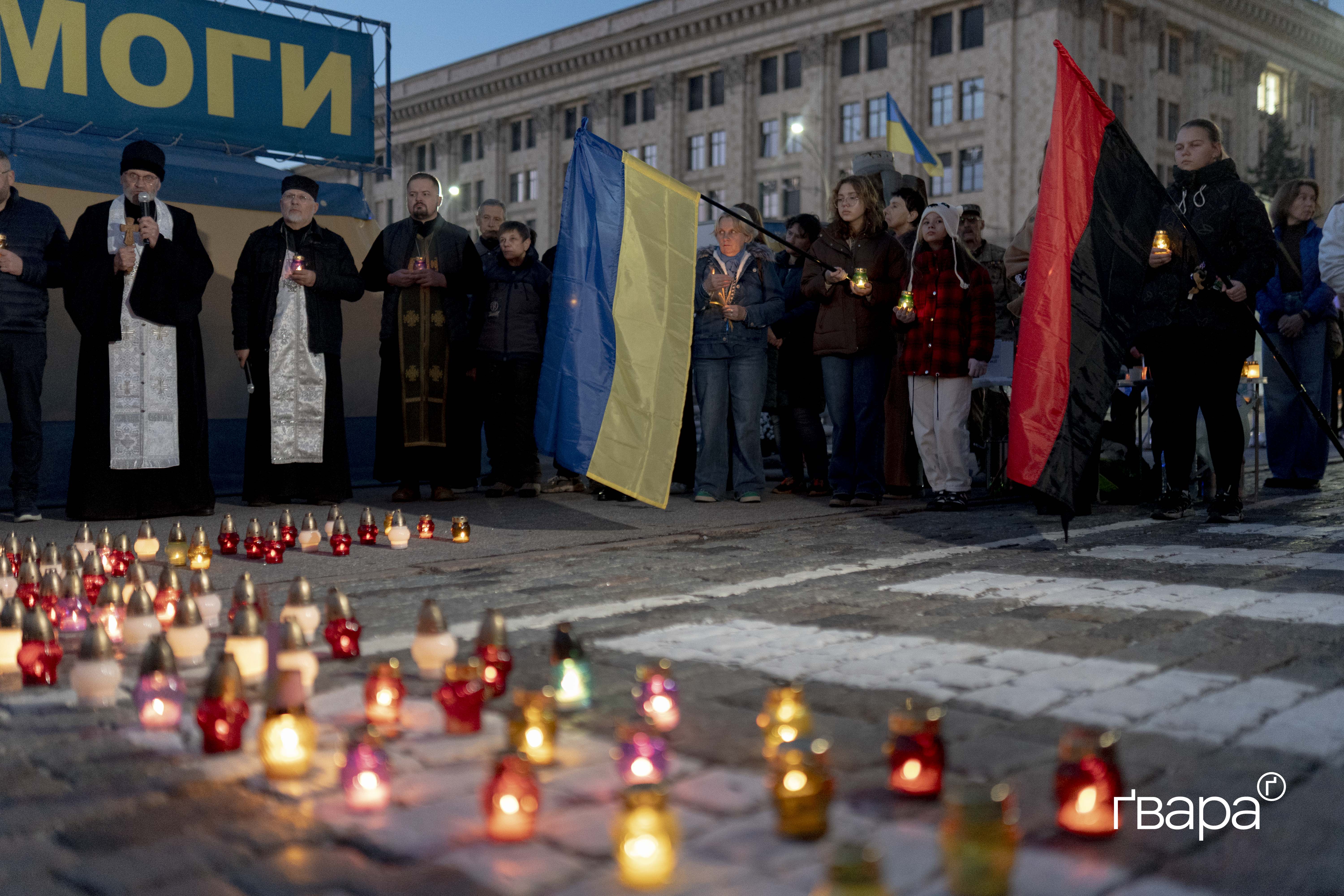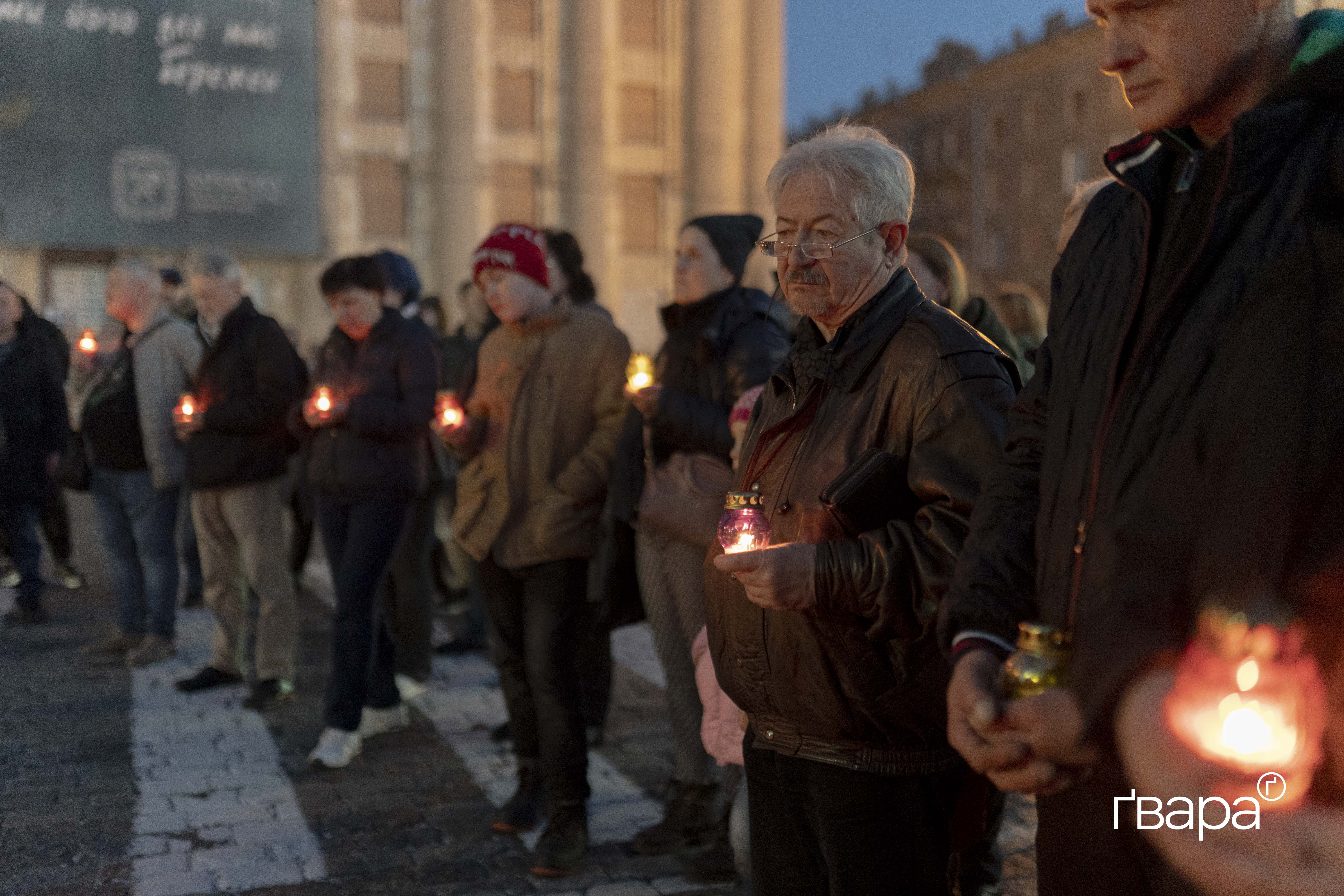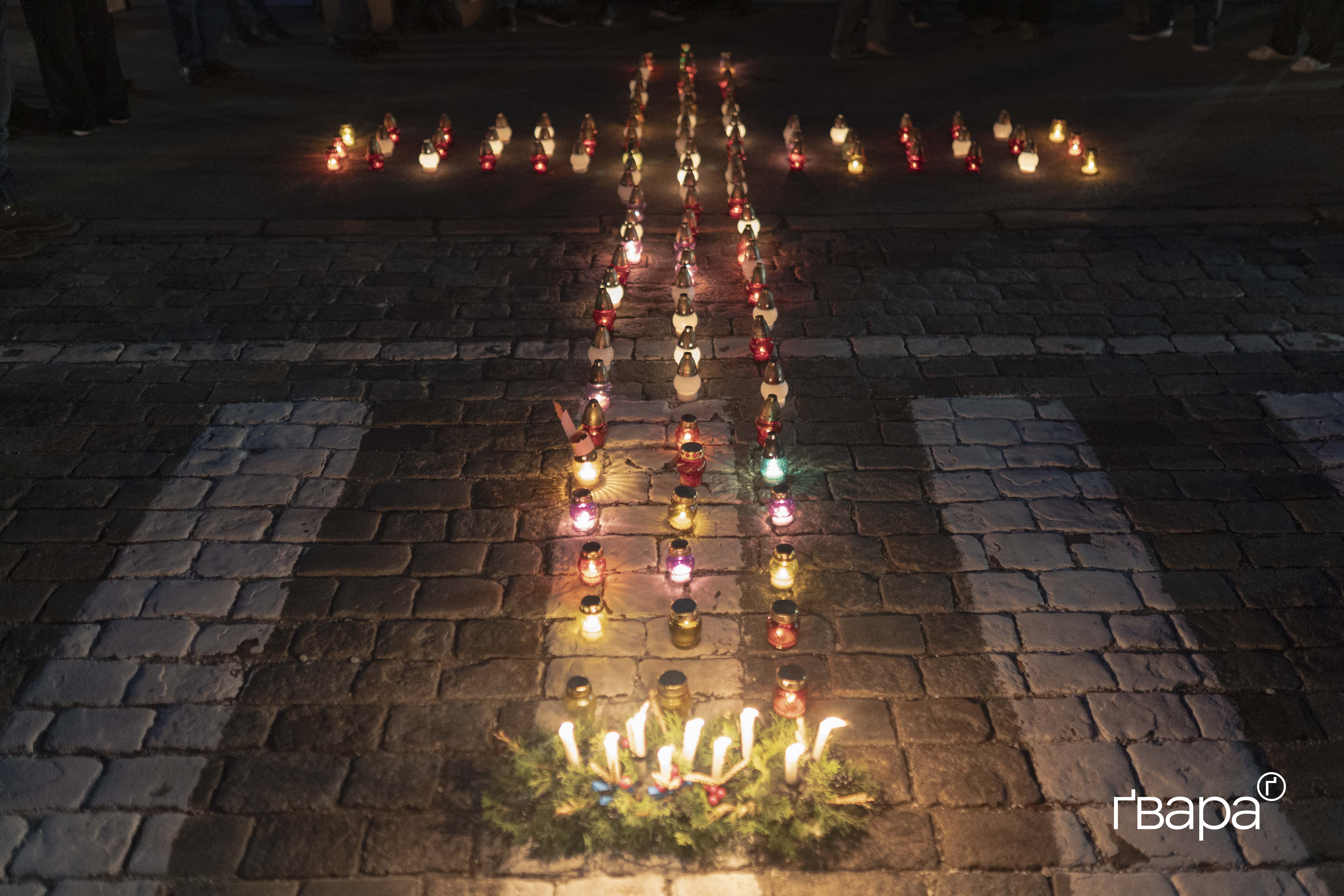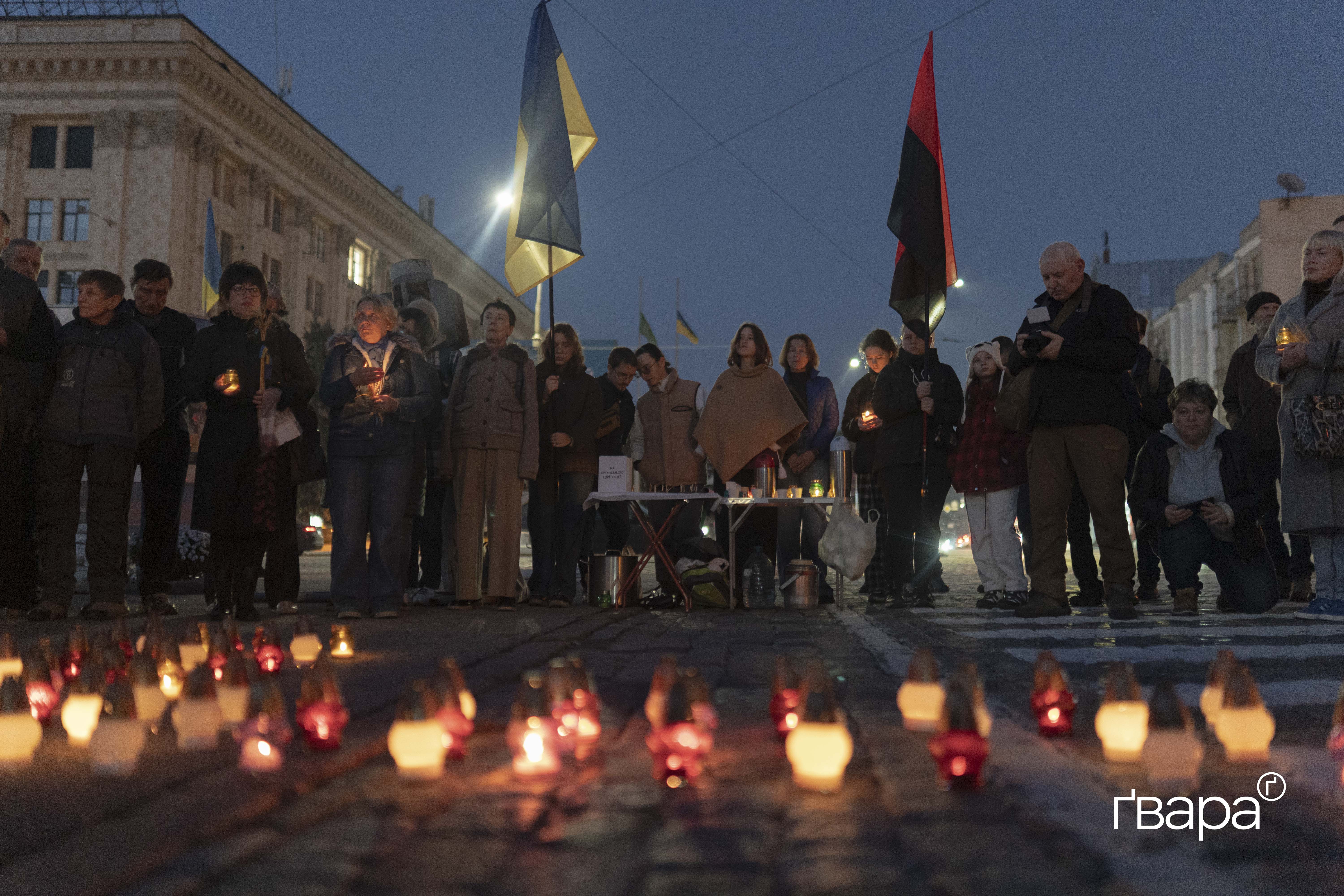 Щоб вшанувати жертв Голодомору протягом вечора харків’яни приносили свічки та лампадки, які разом утворили велику композицію у вигляді хреста.