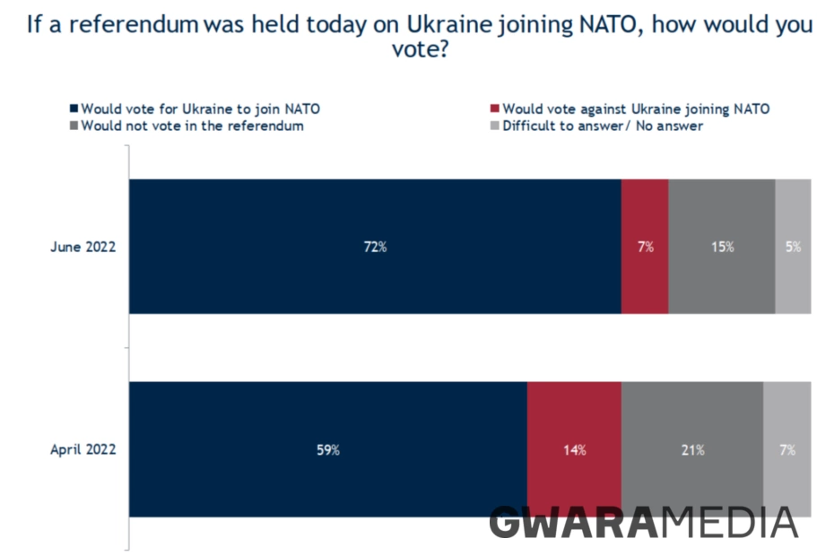 Також зросла підтримка вступу до НАТО: 72% українців підтримали б вступ до НАТО, якби сьогодні відбувся референдум. У порівнянні з квітнем – кількість українців, які підтримують вступ в НАТО збільшилась на 13%.
