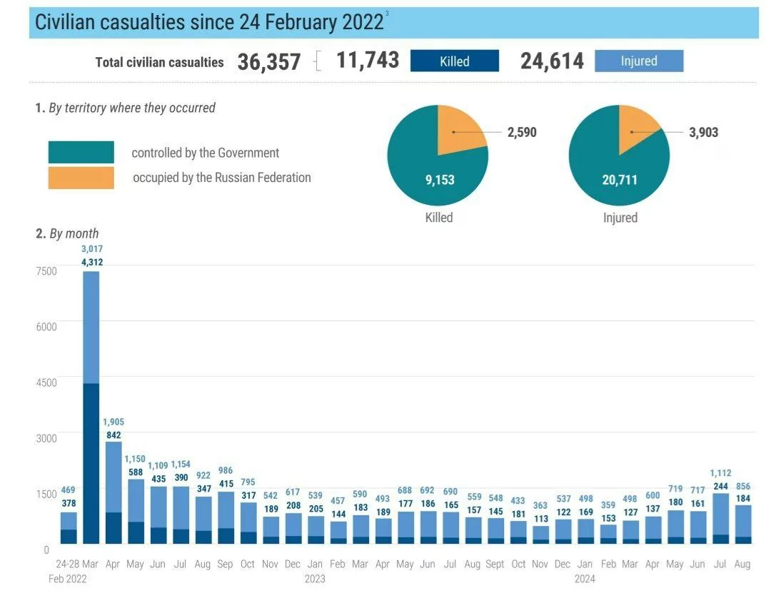 За серпень в Україні внаслідок воєнних дій загинули 184 цивільних мешканців. Щонайменше 856 людей зазнали поранень.