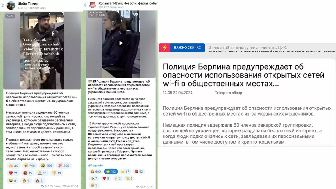 Пропагандистські Telegram-канали такі, як: «Шейх Тамир» (архів), «Rogandar NEWs: Новости, факты, события!» (архів), «Мариупольская ПартиZанка» (архів), «Донецкий Телеграм» (архів), «Антифишки | НОВОСТИ ОНЛАЙН» (архів), «VОZМЕЗДИЕ» (архів), а також російське видання «Мрія» (архів) опублікували відеоролик про те, що нібито поліція Берліна попередила про небезпеку використовувати відкриті wi-fi мережі у громадських місцях через українських шахраїв.