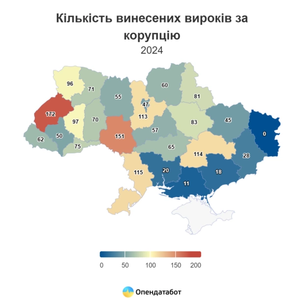 «Варто зауважити, що кількість записів по регіонах скоріш відбиває процеси стабільної роботи судів, аніж реальну кількість та локалізацію корупціонерів», – додають у Опендатабот.