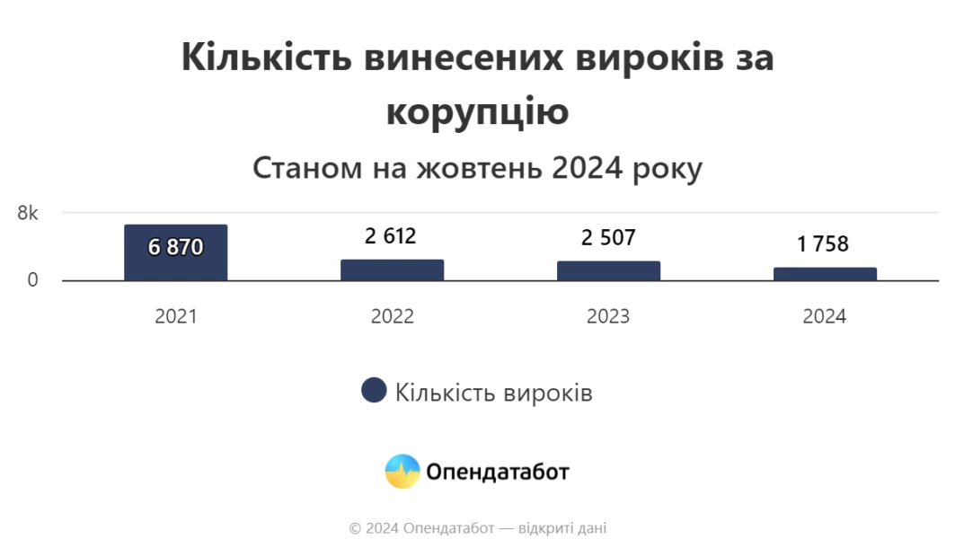 Загалом від початку широкомасштабної війни було винесено 6 877 вироків корупціонерам. А від початку 2024 року вже винесено 1 758 вироків.