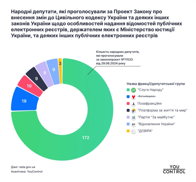 Так, законопроєкт №11533 передбачає обмеження доступу до публічних електронних реєстрів Мін’юсту та інших держателів даних. Законопроєкт №13420 — щодо змін до Податкового кодексу та підтримки підприємств ОПК.