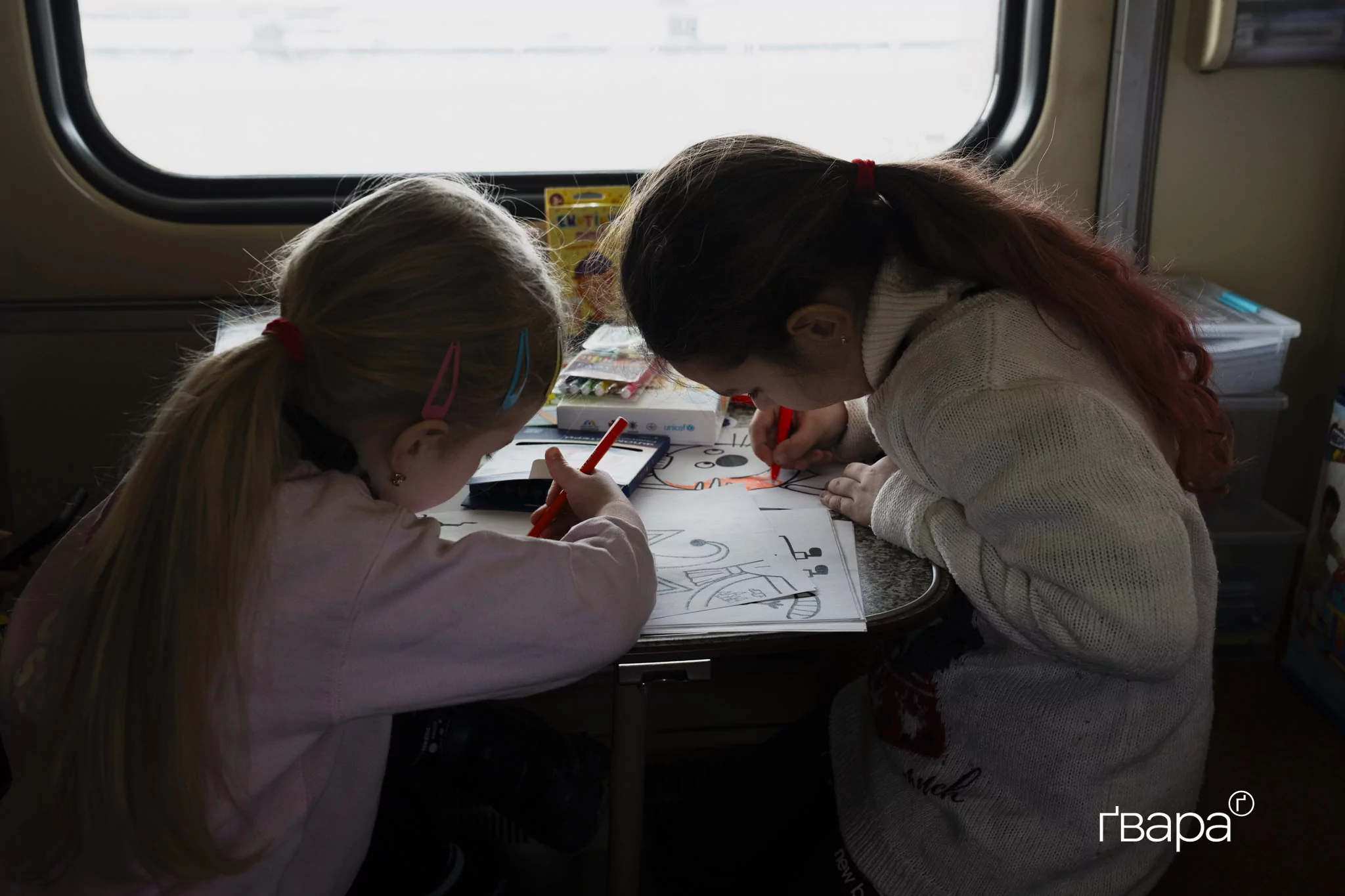 Жанна, яка разом із дитиною чекає на свій потяг, вирішила скористатися можливістю зігрітися у вагоні незламності. Жінка поділилася, що для дітей створили спеціальну зону, де можна гратися та малювати.