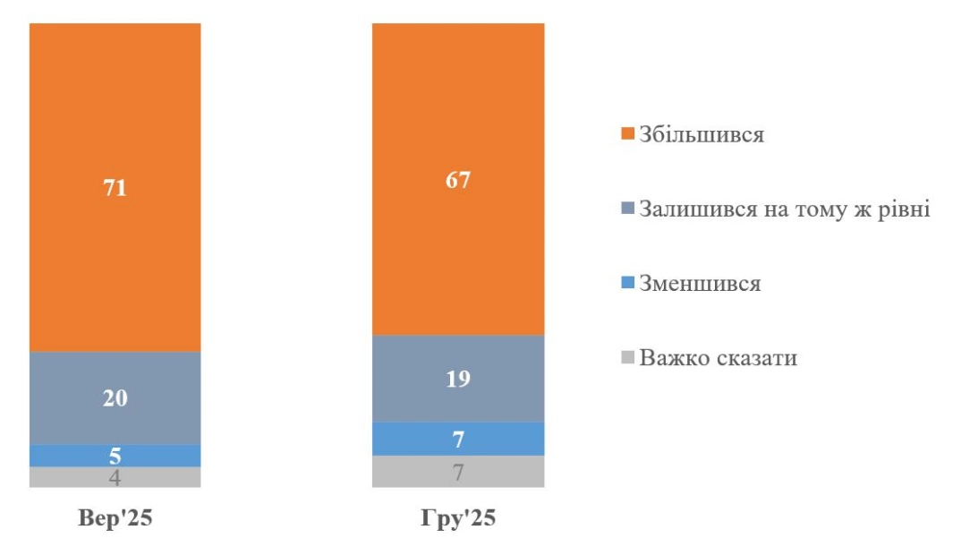 Згідно з даними дослідження, 67% респондентів заявили про зростання корупції. Водночас у вересні 2025 року такої думки дотримувалися 71% опитаних, що свідчить про незначне зменшення цього показника.