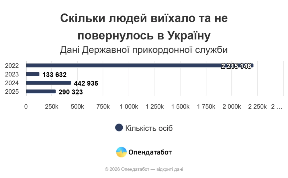 У 2025 році з України виїхали за кордон і не повернулися 290,3 тисячі громадян. Це у півтора раза менше, ніж у 2024 році – тоді назад не повернулось майже 443 тисячі.