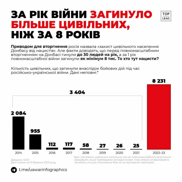 З 24 лютого 2022 року росіяни вбили понад 8 тисяч цивільних, в той час за 8 років війни на Донбасі загинули 3404 мирних громадяни України.