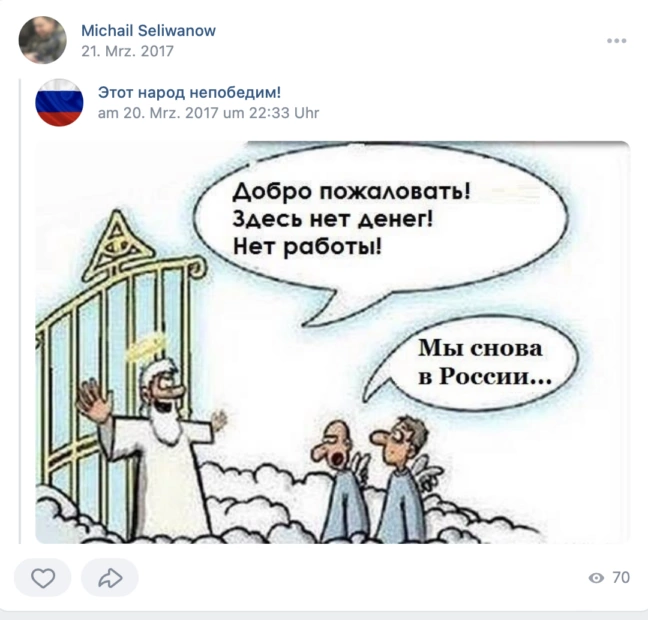 Окремо звернемо увагу на політичні погляди окупанта, якими він активно ділився у 2017 році. Селіванов жартує про поїдання снігурів, відсутність кар’єрних можливостей, грошей та доріг у РФ. Разом із тим, поширює «патріотичні» картинки, пишаючись, як «діди воювали».